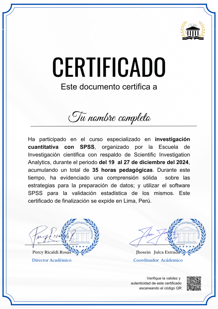 El certificado de finalización cuenta con el respaldo de la Escuela de Investigación Científica (EIC) y Scientific Investigation Analytics (SIA) tras participar y completar un programa de 35 horas académicas.